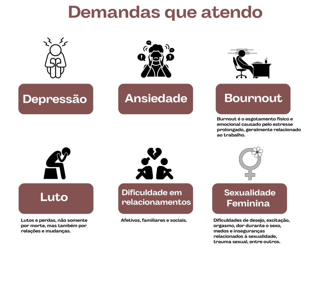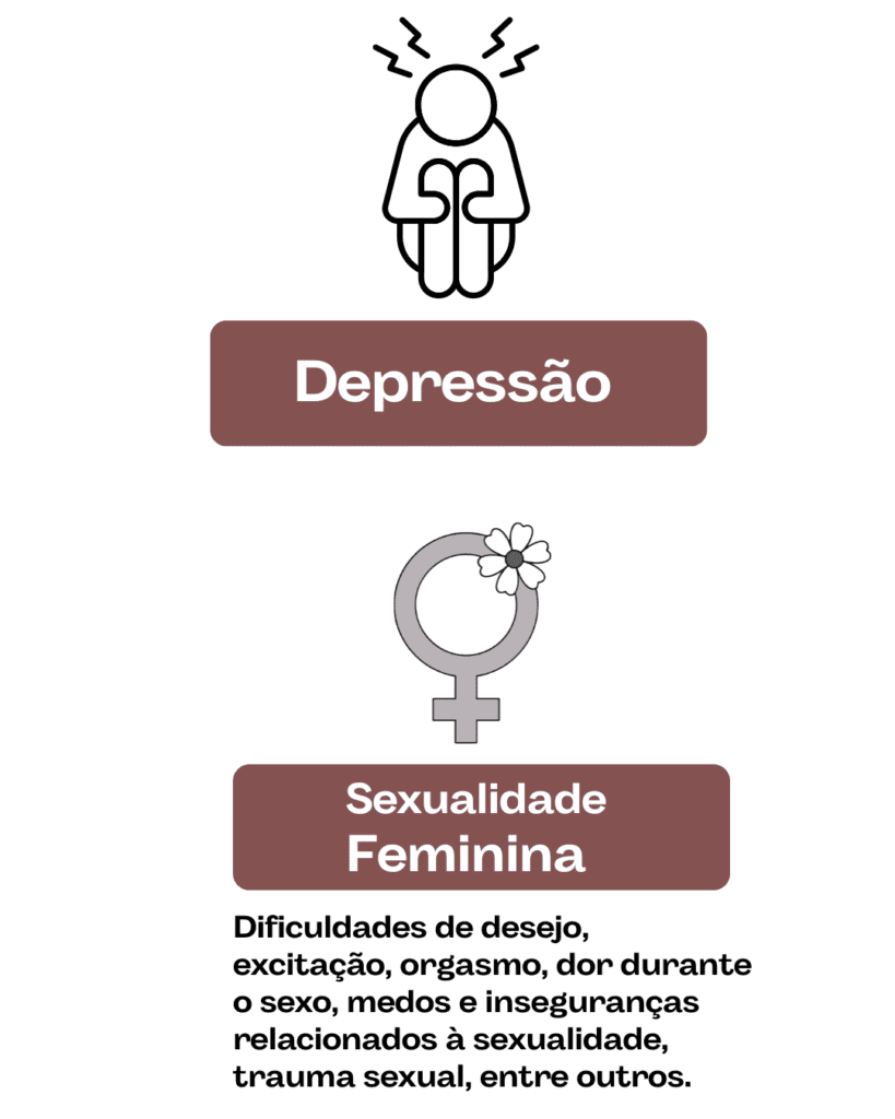 Questões como dificuldade de desejo, dor na relação, desafios na excitação ou no orgasmo, mudanças da menopausa, conflitos emocionais e impactos de vivências traumáticas, como o abuso sexual, podem ser trabalhadas com sensibilidade e no tempo de cada mulher, em um espaço livre de julgamentos.